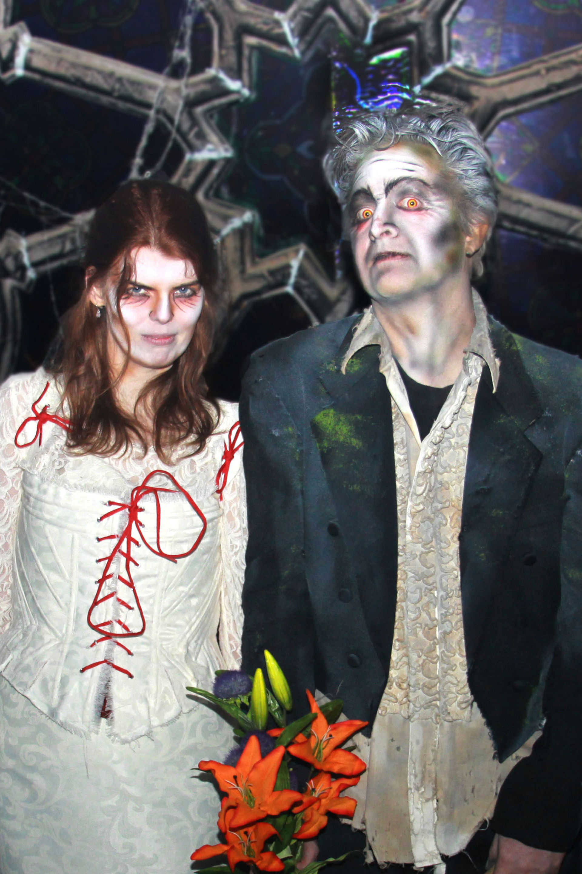 The ceremony was held on Saturday night at midnight, on the 31st of October. Chris has worked at the Wisconsin Feargrounds in Waukesha for the past few years. This year a unique opportunity arose. The owner of the haunted house decided to build a chapel as part of the attraction. After the last guest left on the morning of Halloween, it became the location for our wedding.